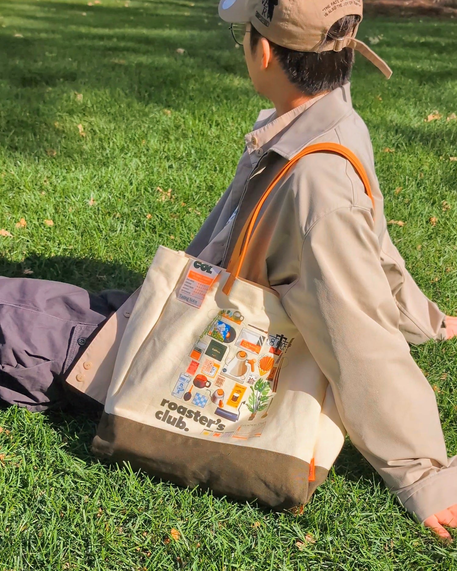 A tote bag inspired by coffee beans and tools typically found in a café. Perfect for carrying coffee brewing gear, art supplies, notebooks, etc.