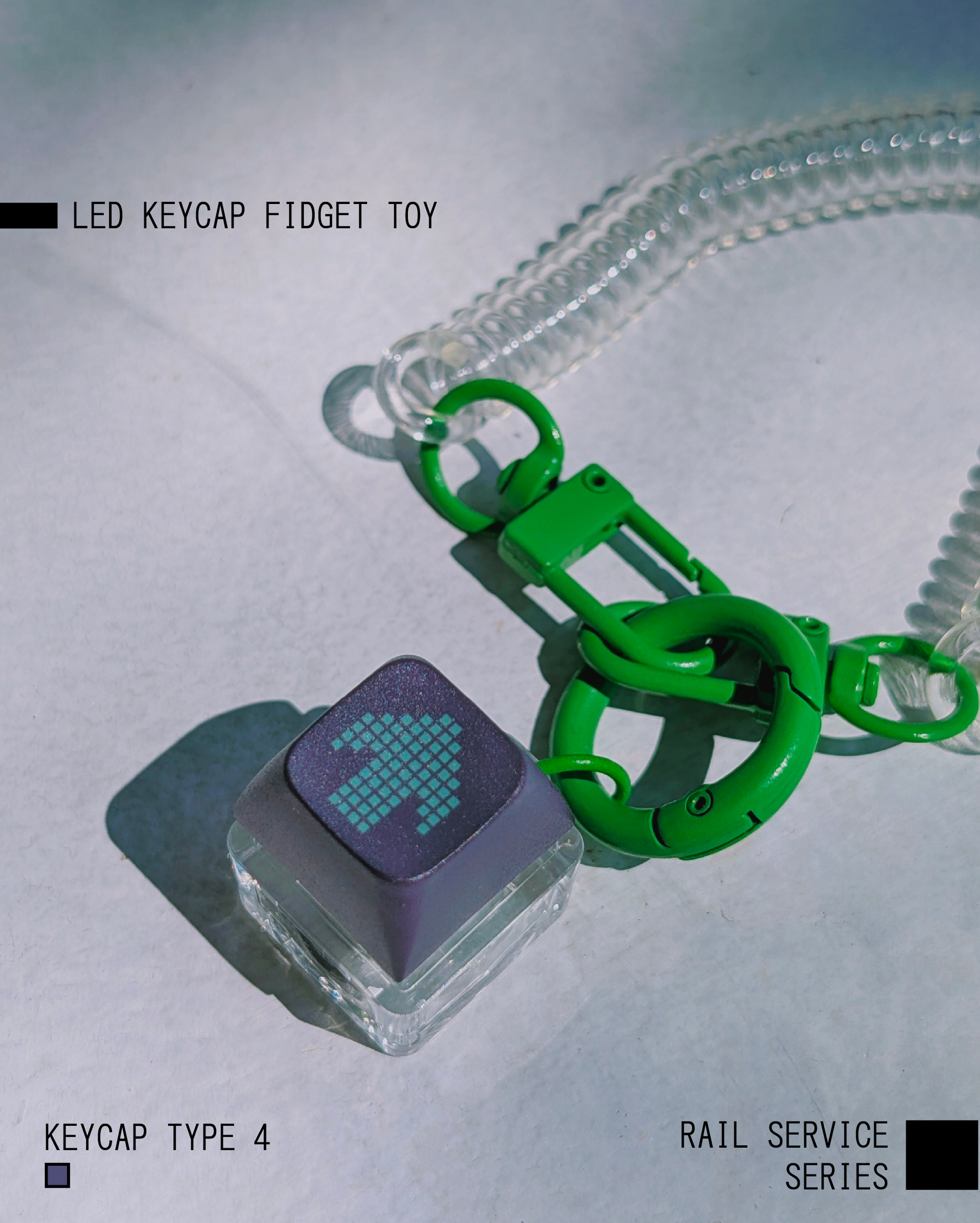 An LED battery powered keycap fidget toy. Metal clasps and detachable cord included.