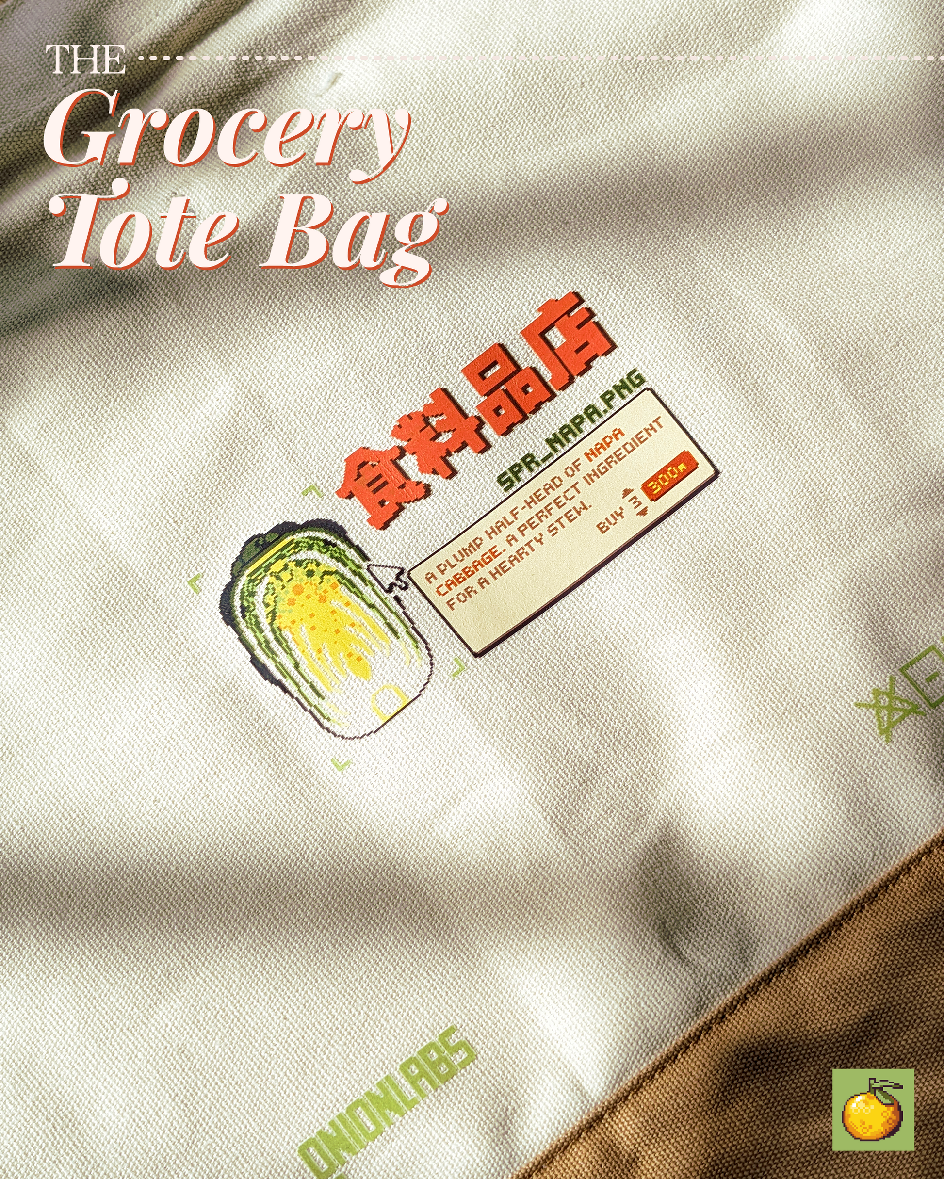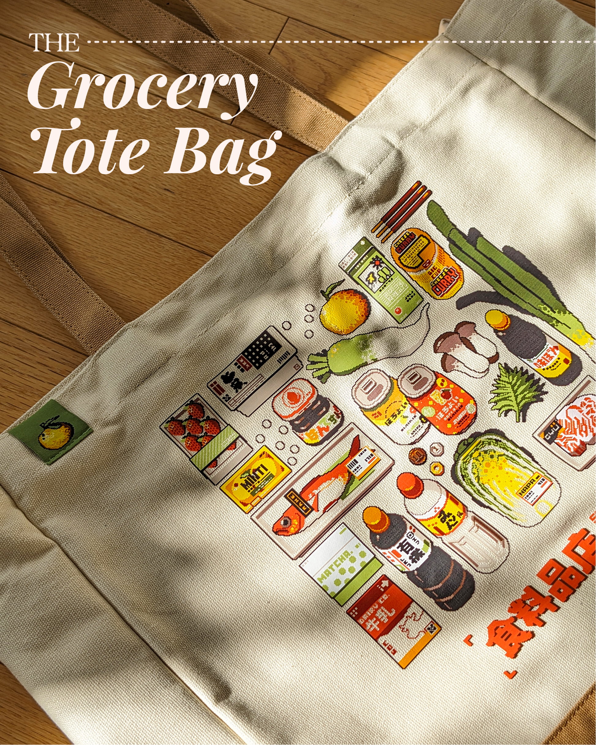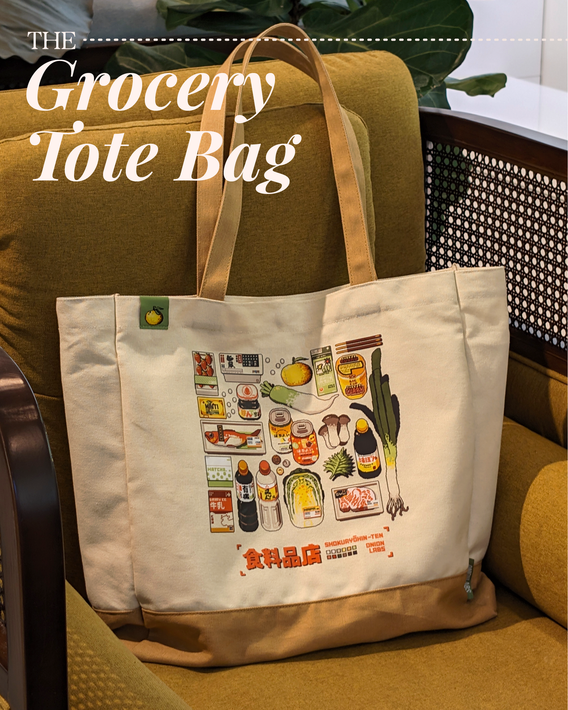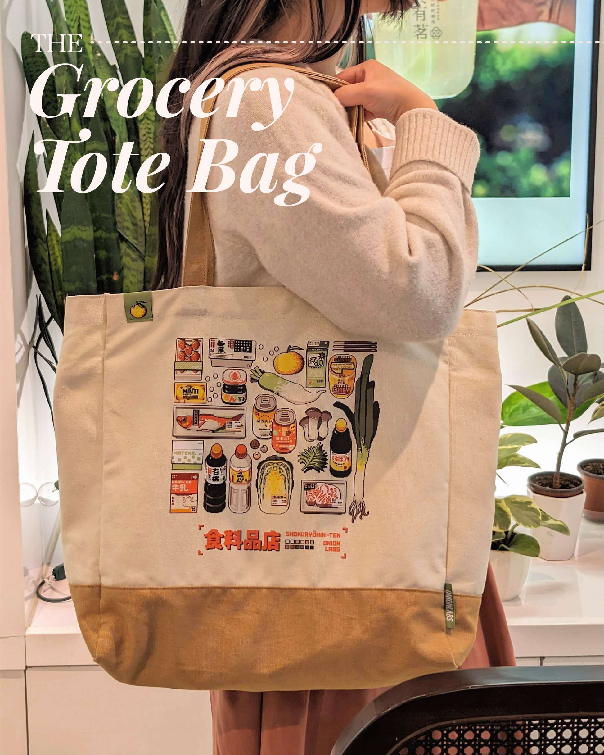 PATCH 1.2 the final version. A tote bag inspired by the produce found at a typical Japanese grocery store. Perfect for carrying groceries, art supplies, notebooks, etc.